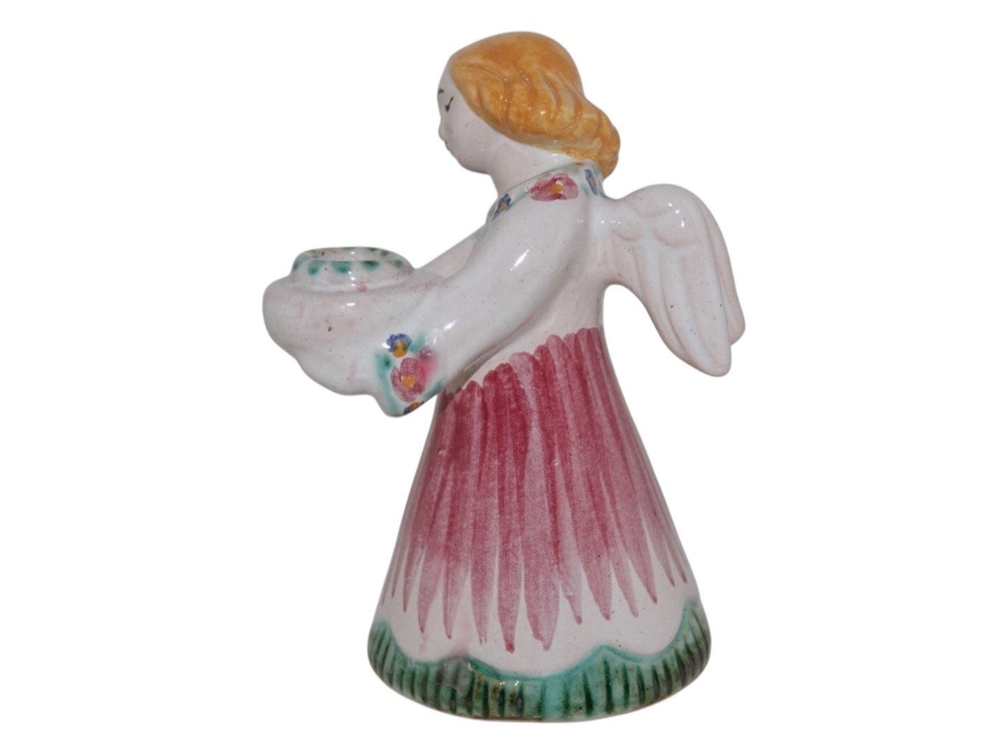 Hjorth Keramik, engel figur / lysestage med rød, grøn og gul dekoration. Dekorationsnummer 420. Højde 11,5 cm. Perfekt stand.