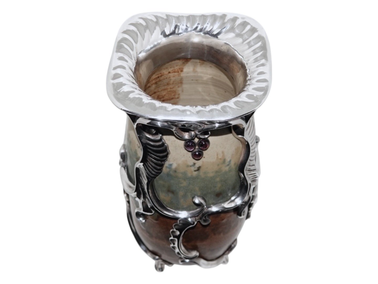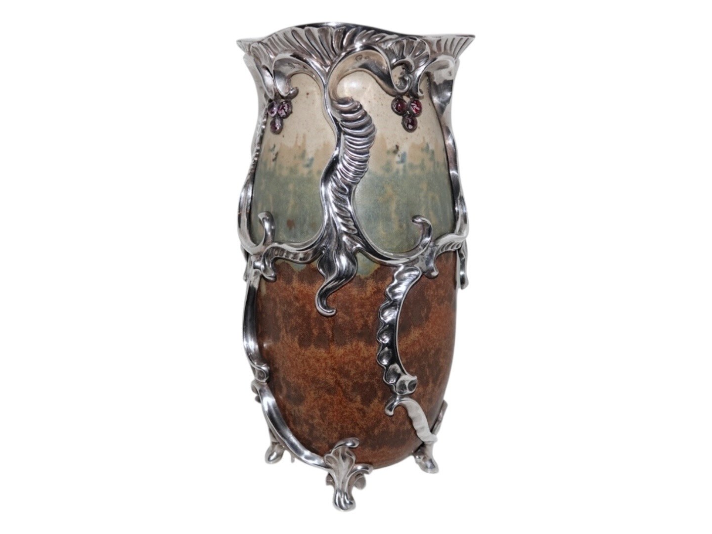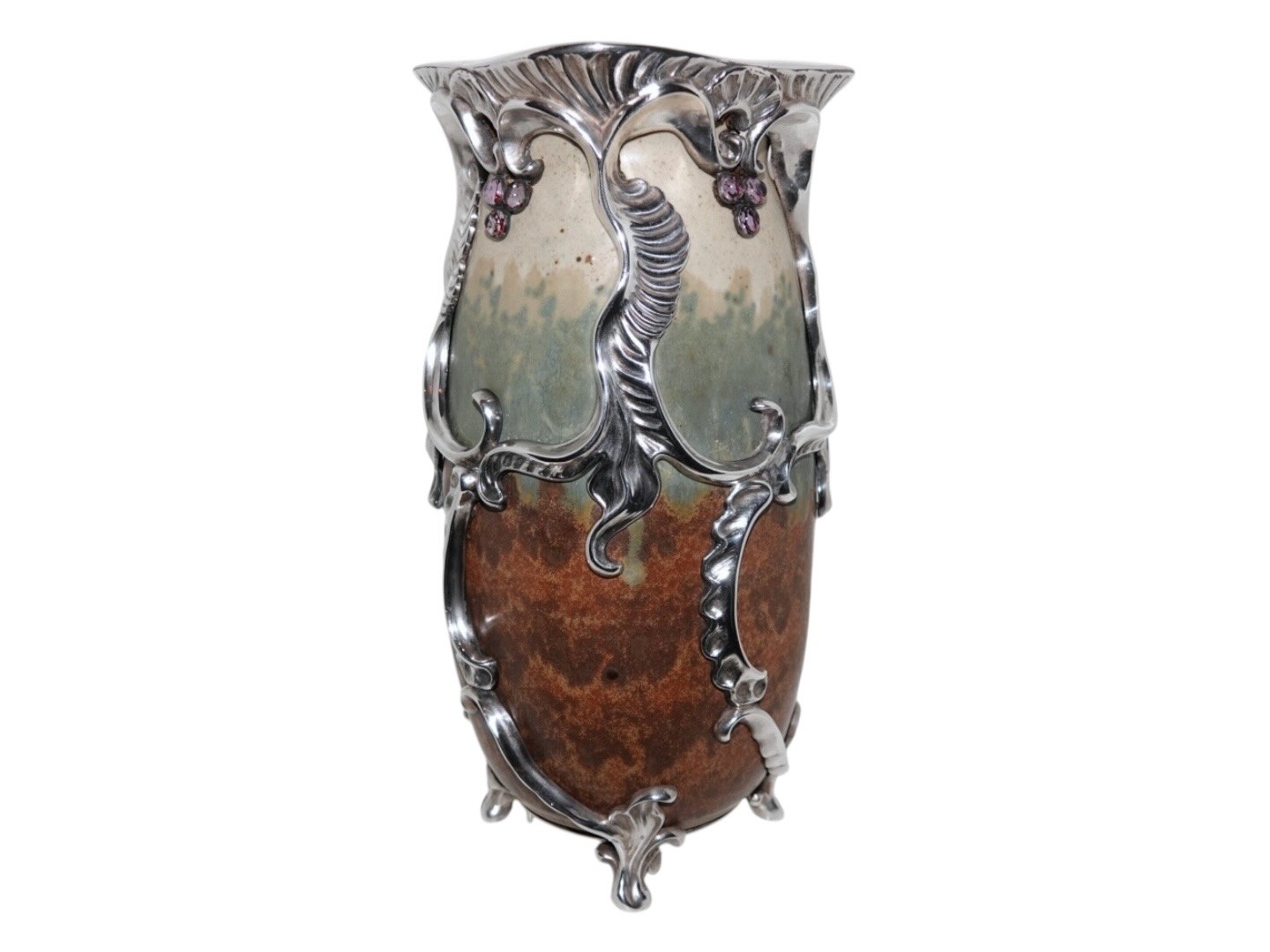Royal Copenhagen keramik, stor og unik Patrick Nordström vase med original, ekstravagant og kraftig sølvmontering og ametyster.