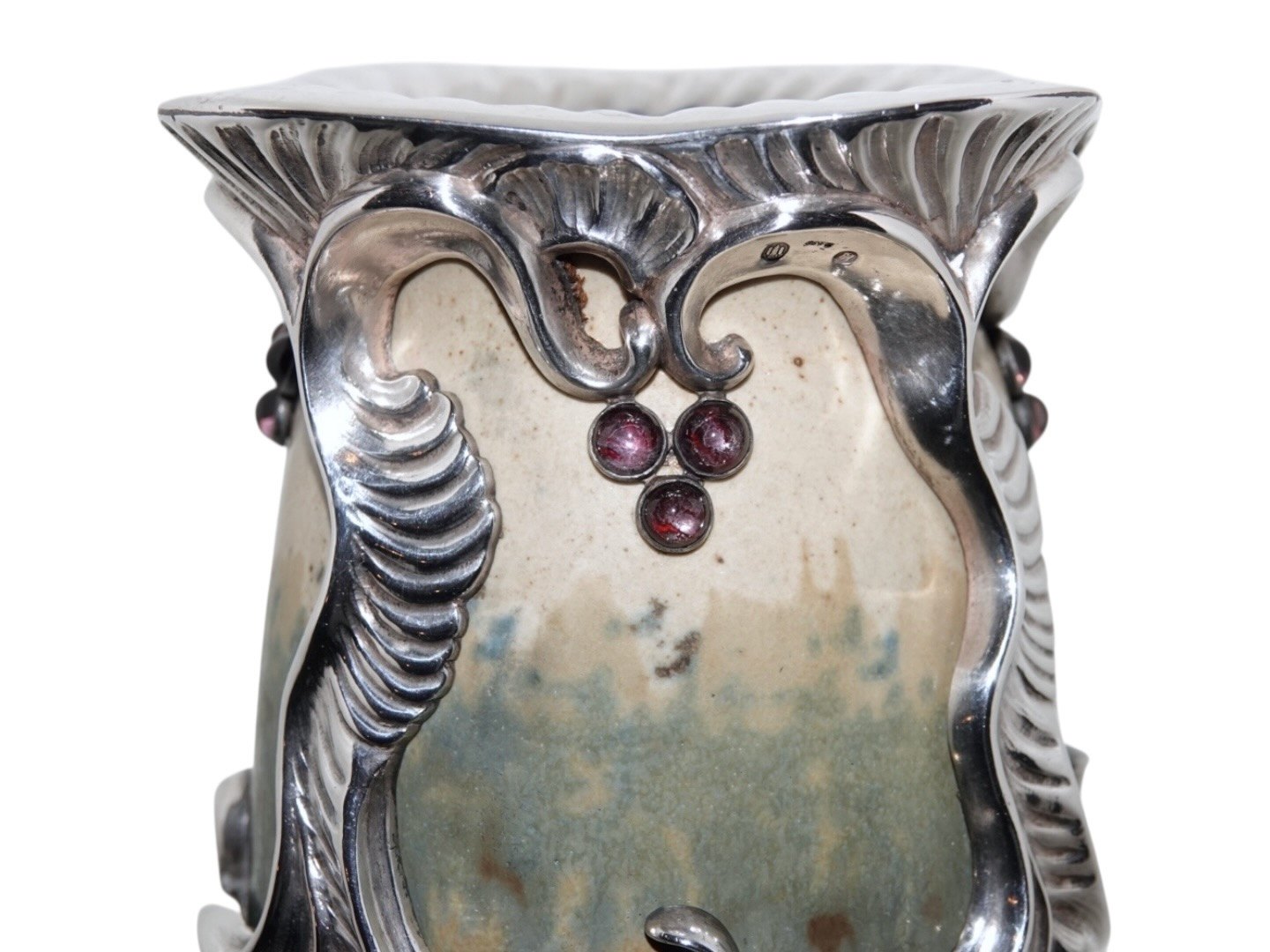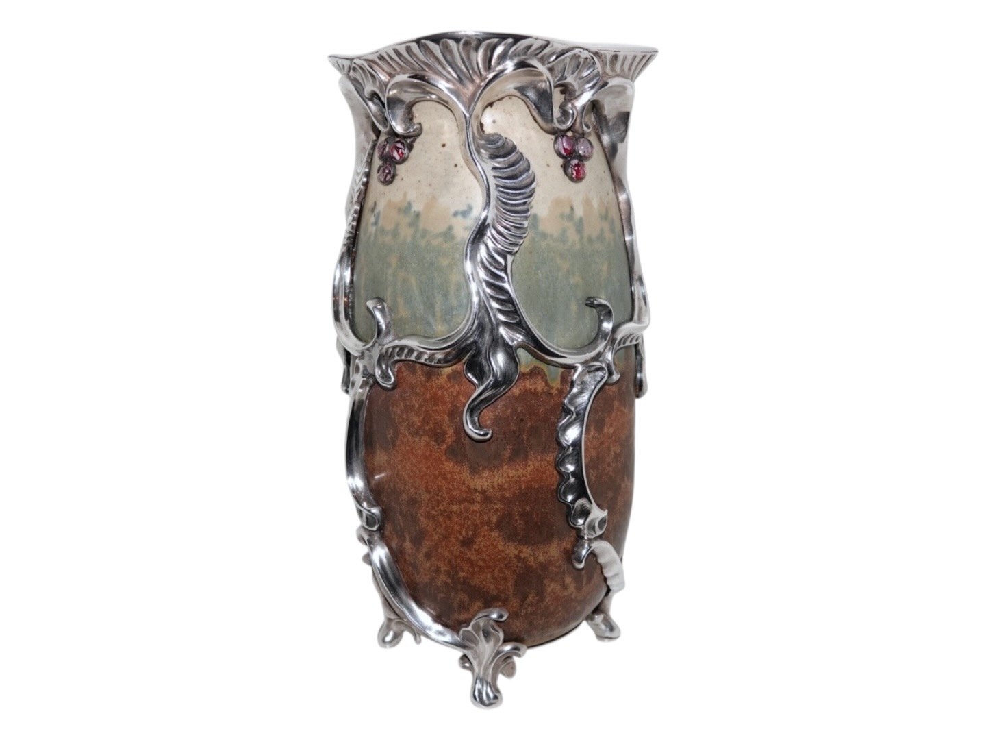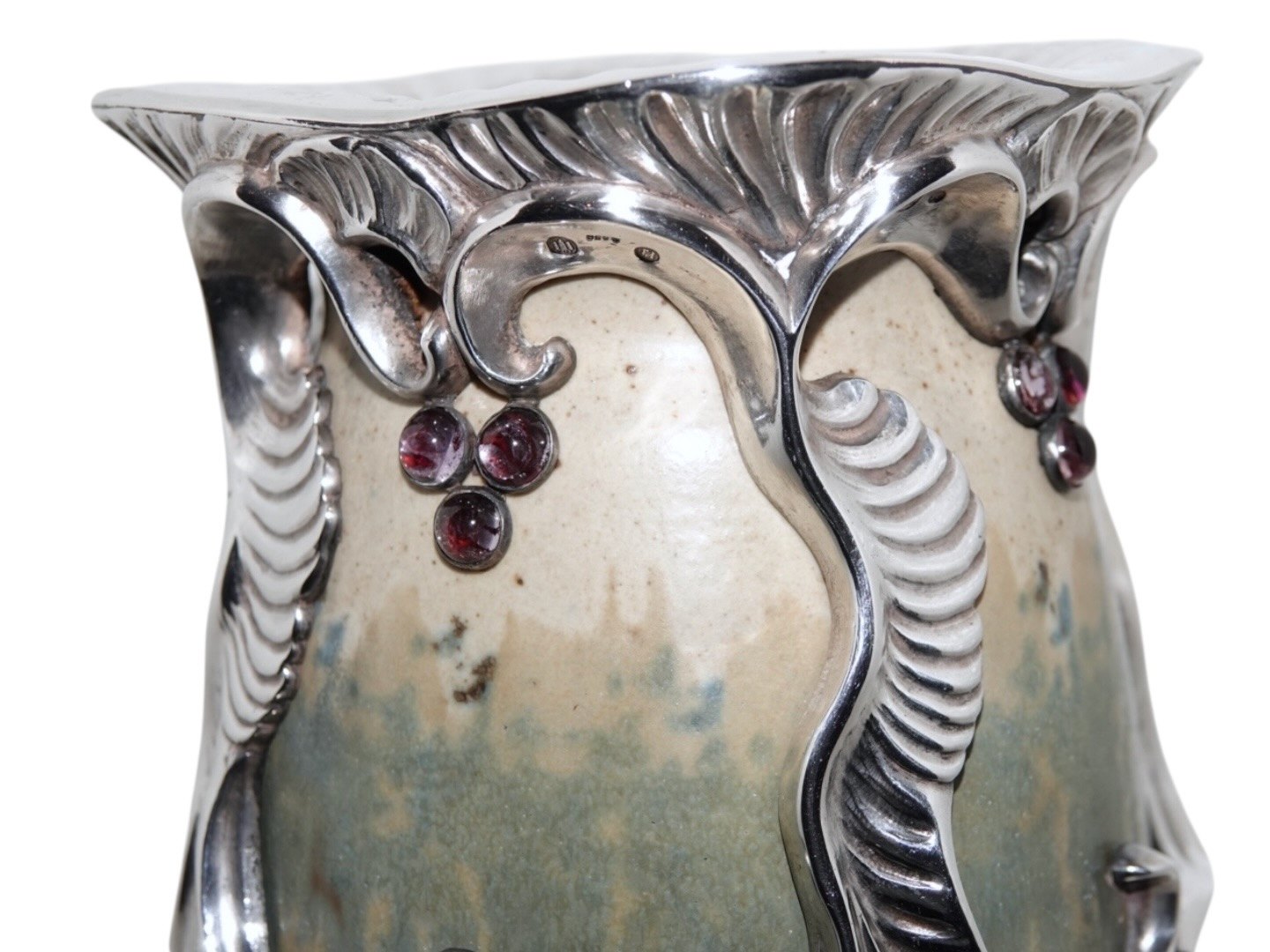 Royal Copenhagen keramik, stor og unik Patrick Nordström vase med original, ekstravagant og kraftig sølvmontering og ametyster.