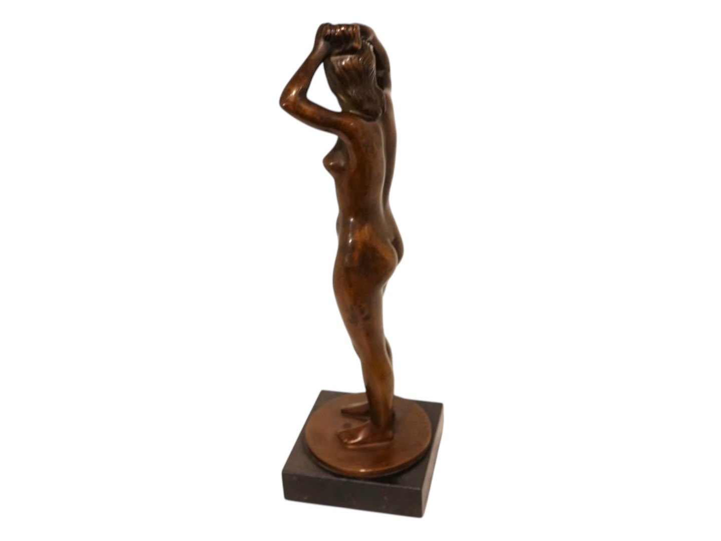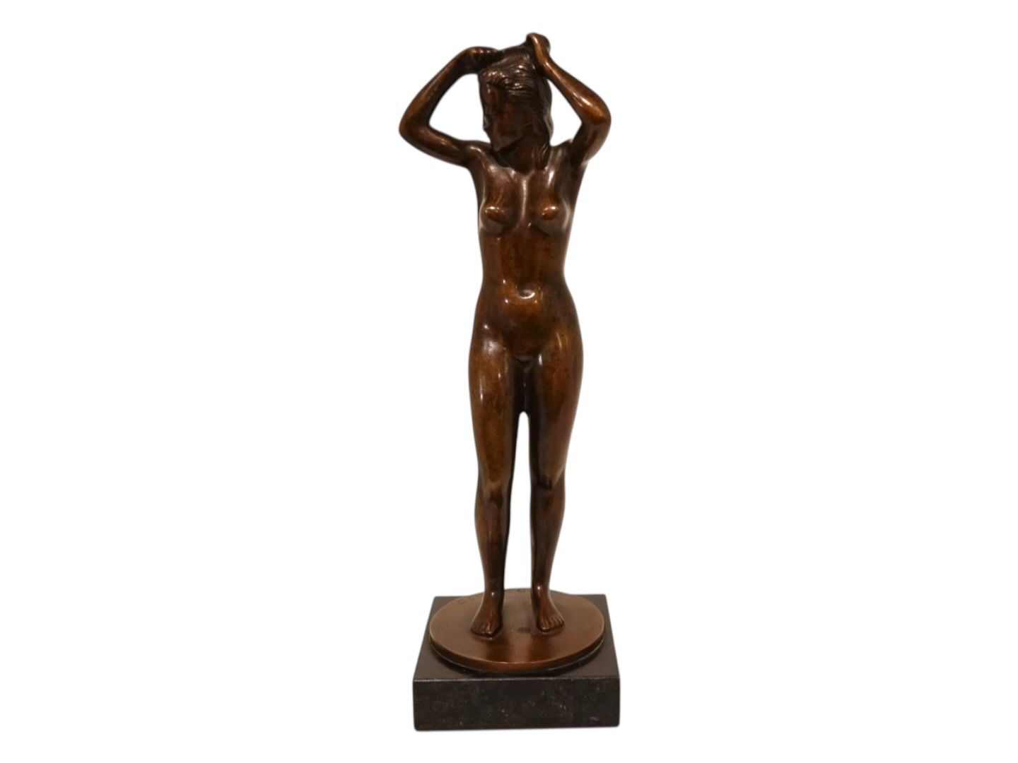 Volmer Bahner (1912-1995) bronze figur af nøgen dame der reder sit hår. Hun står på en sten sokkel. Signeret "V. Bahner". Højde 24,0 cm. Figuren har en flot patina og fremstår i fin stand.