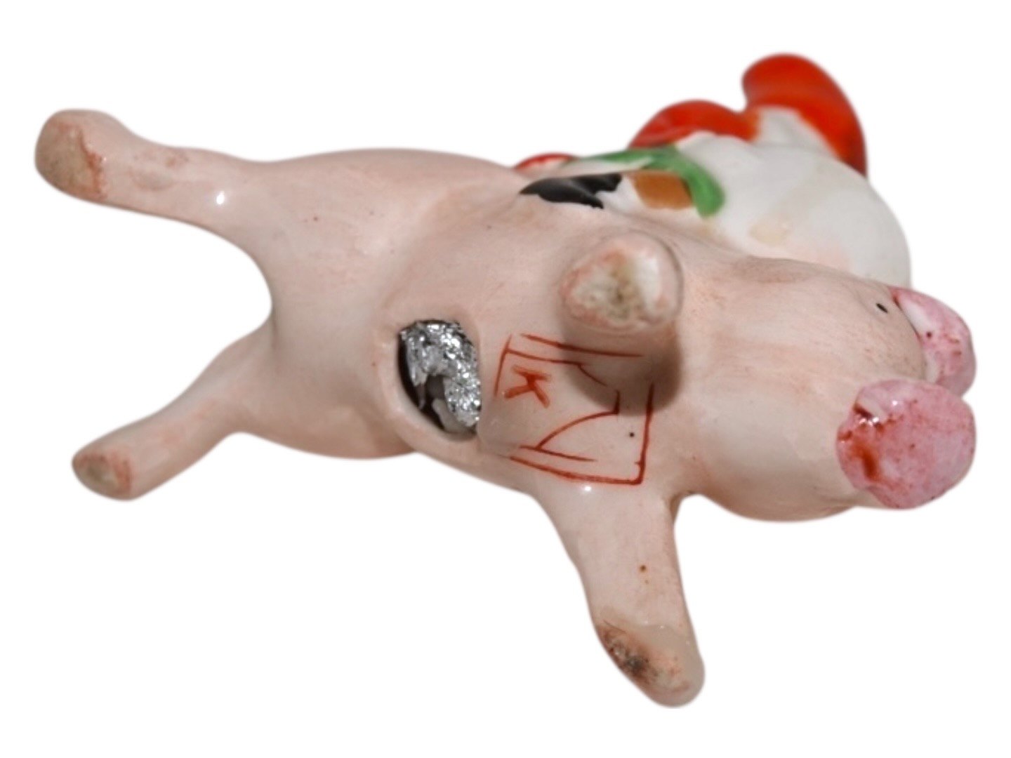 Julemand på gris figur / lysestage til et lille stearinlys. Den er fra ca. 1950. Længde 6,5 cm., højde 6,8 cm. Fin og velholdt stand.