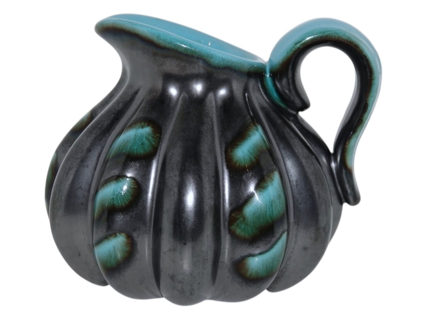 Michael Andersen keramik, lille græskarformet kande. Dekorationsnummer 4627. Længde 12,5 cm., højde 10,2 cm. inklusiv hanken. Perfekt stand uden fejl.