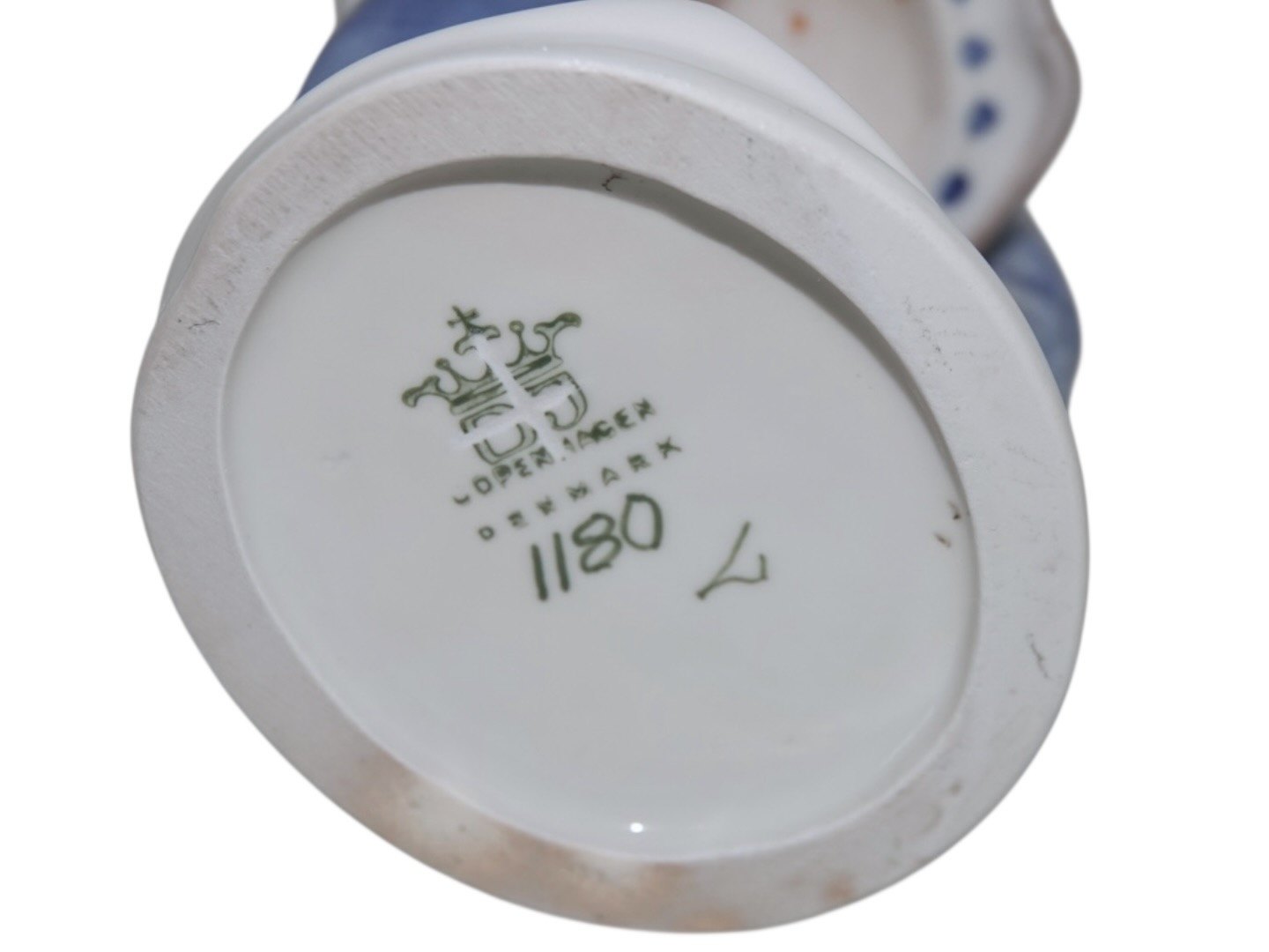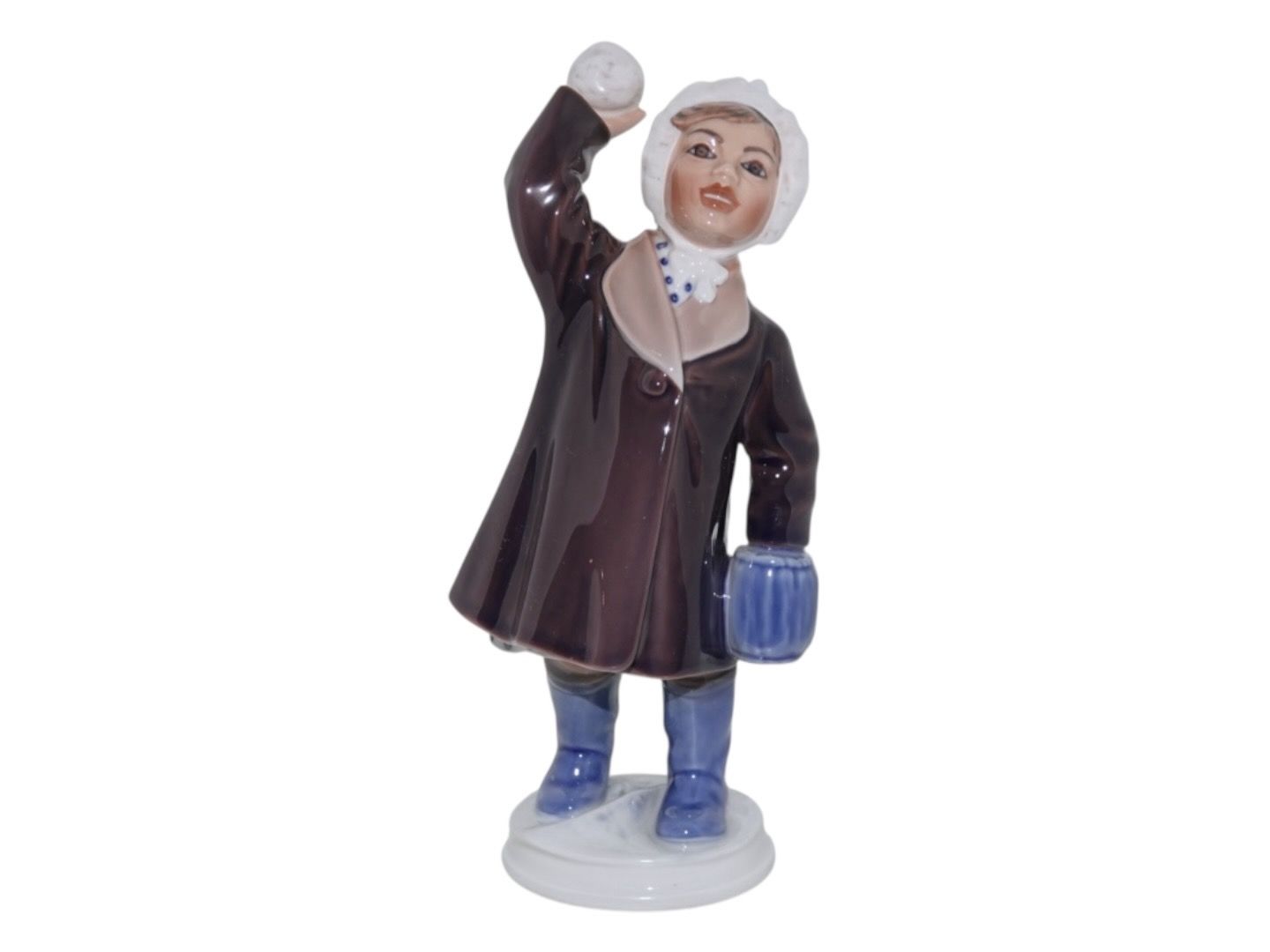 Dahl Jensen figur, Pige med snebold. Af fabriksmærket ses det, at denne er produceret mellem 1928 og 1985. Dekorationsnummer 1180. 3. sortering. Højde 19,6 cm. Perfekt stand uden fejl.
