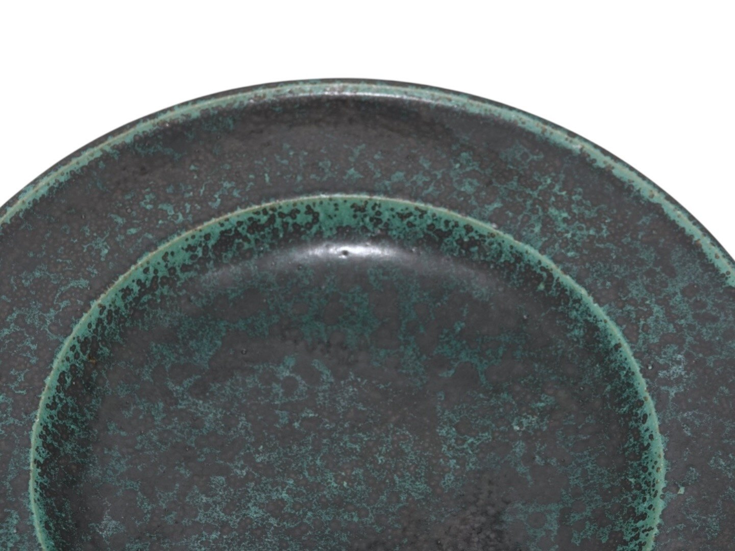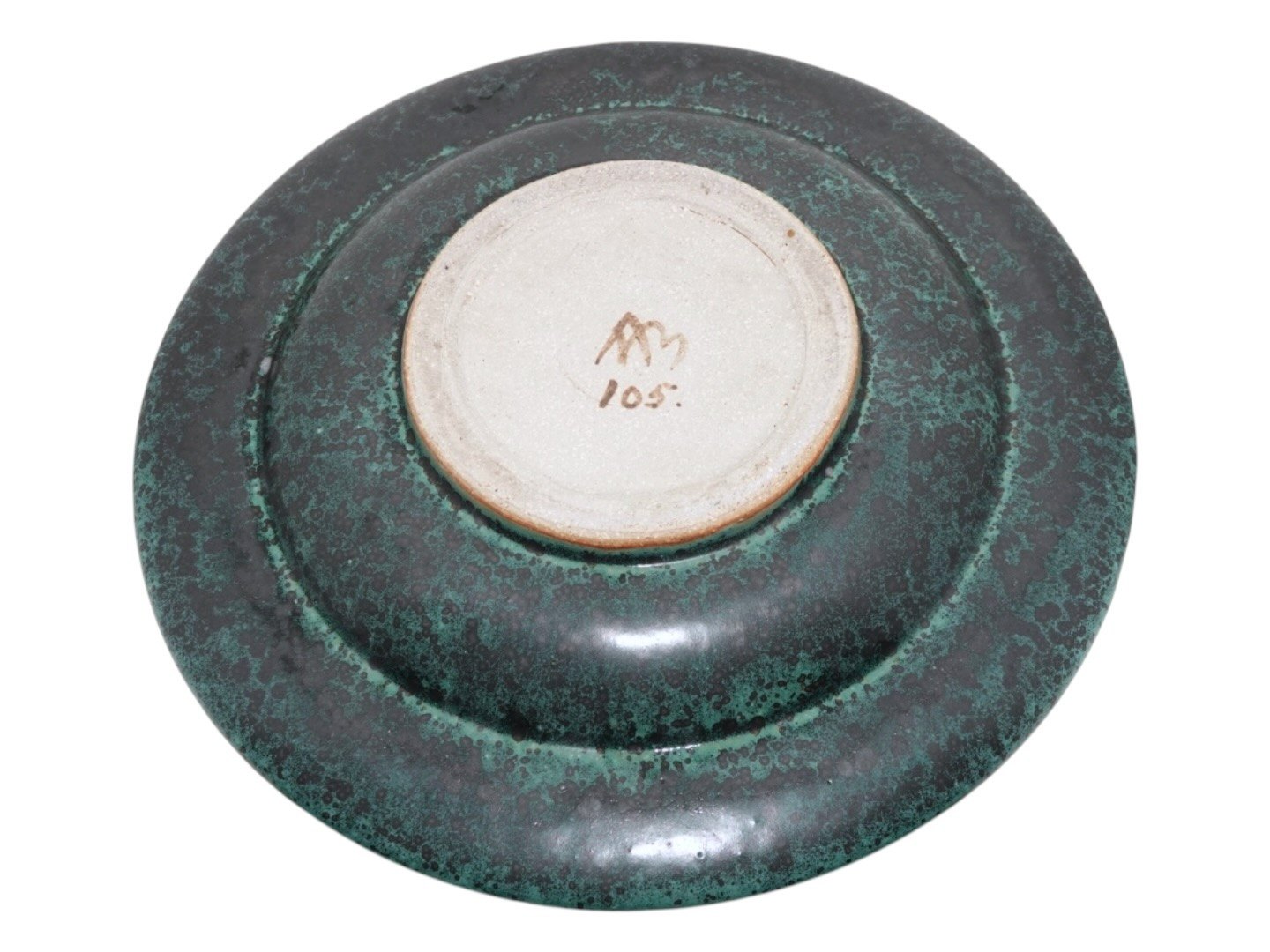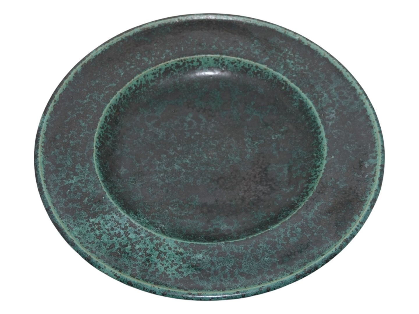 Arne Bang keramik, stort rundt fad med en mørkegrøn glasur.
