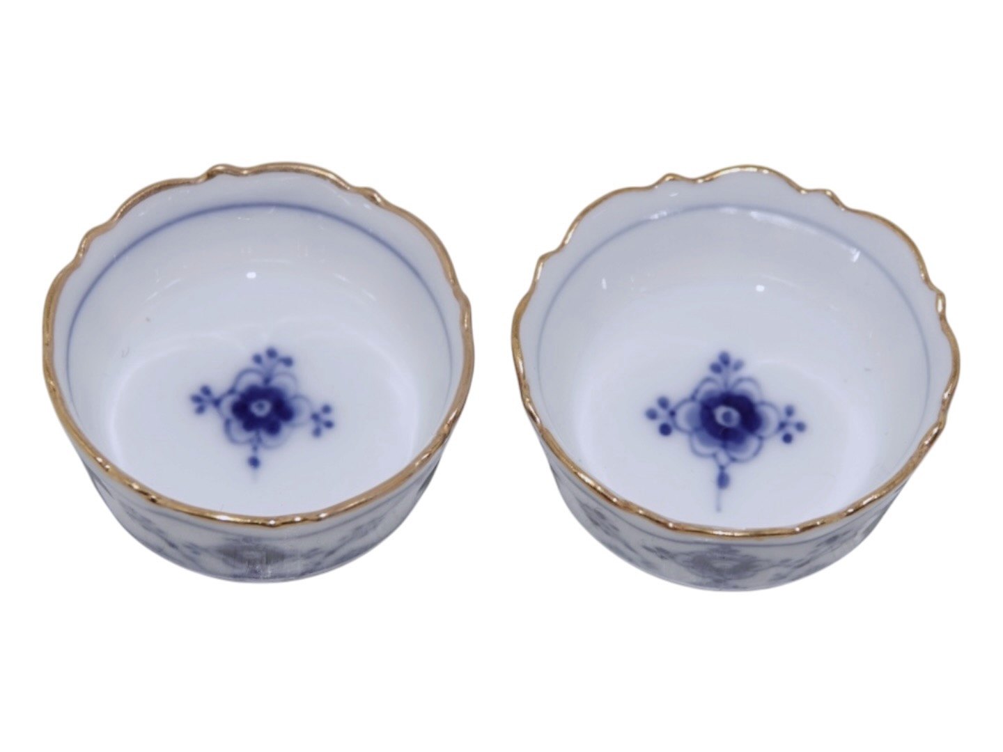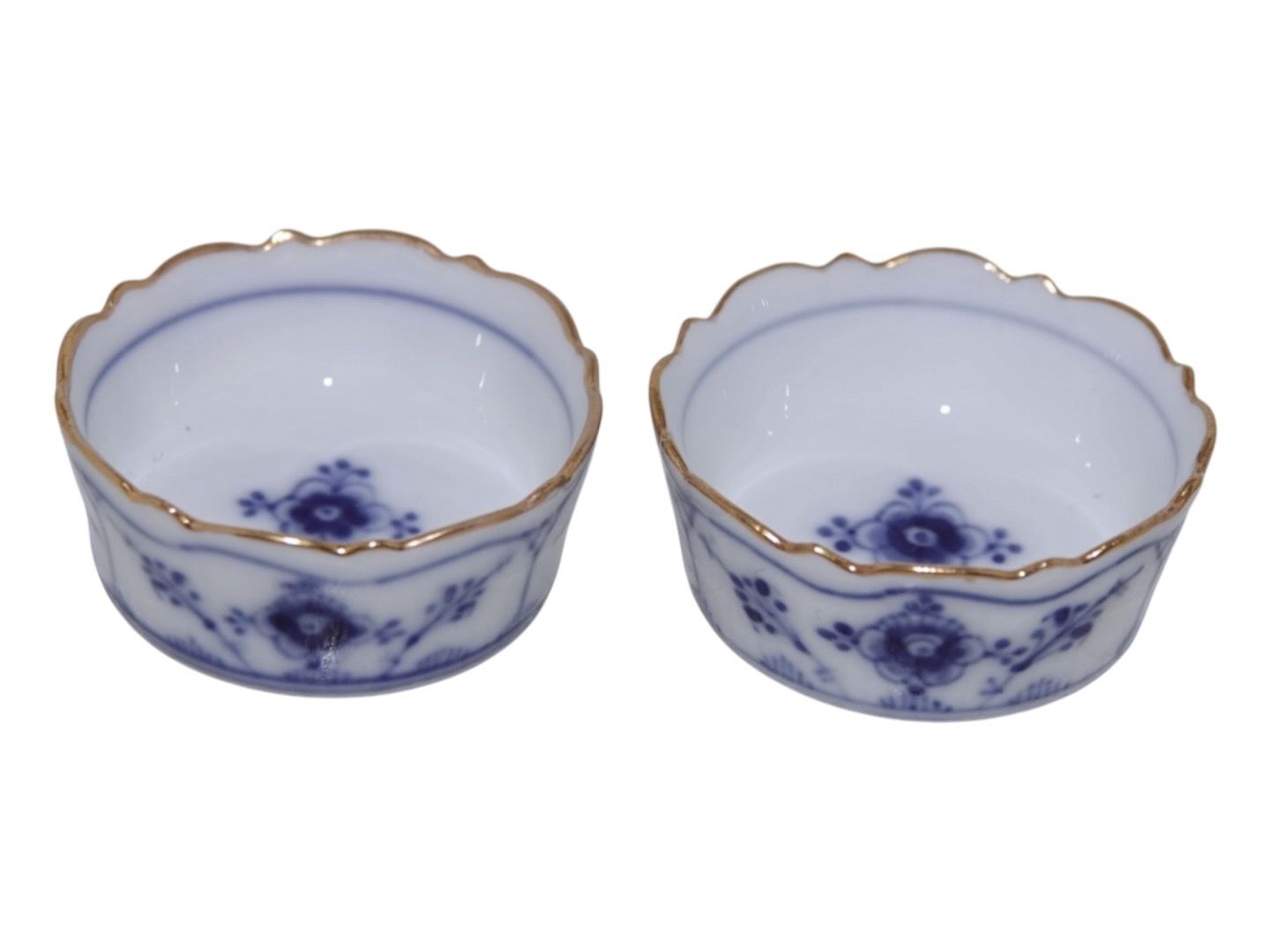 Royal Copenhagen Musselmalet Riflet med guldkant, små runde saltkar / kuvertsaltkar.