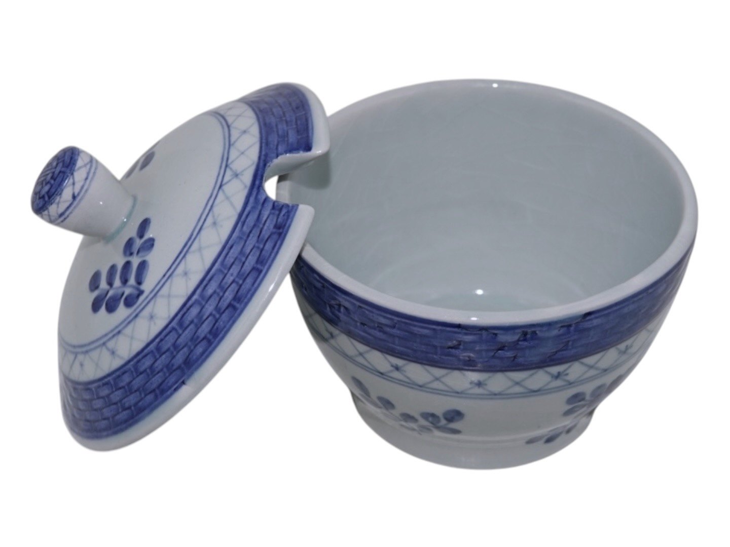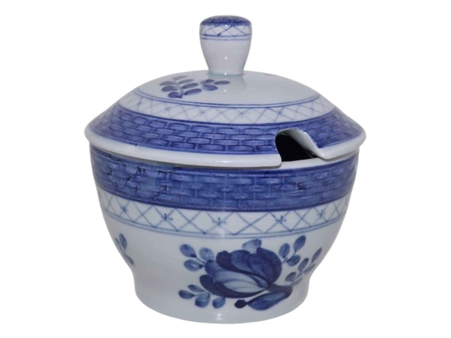 Aluminia Tranquebar, sjælden set marmeladekrukke. Dekorationsnummer 11/953. 1. sortering. Diameter 10,0 cm. Der er svage krakkeleringer i glasuren ellers perfekt stand uden fejl.