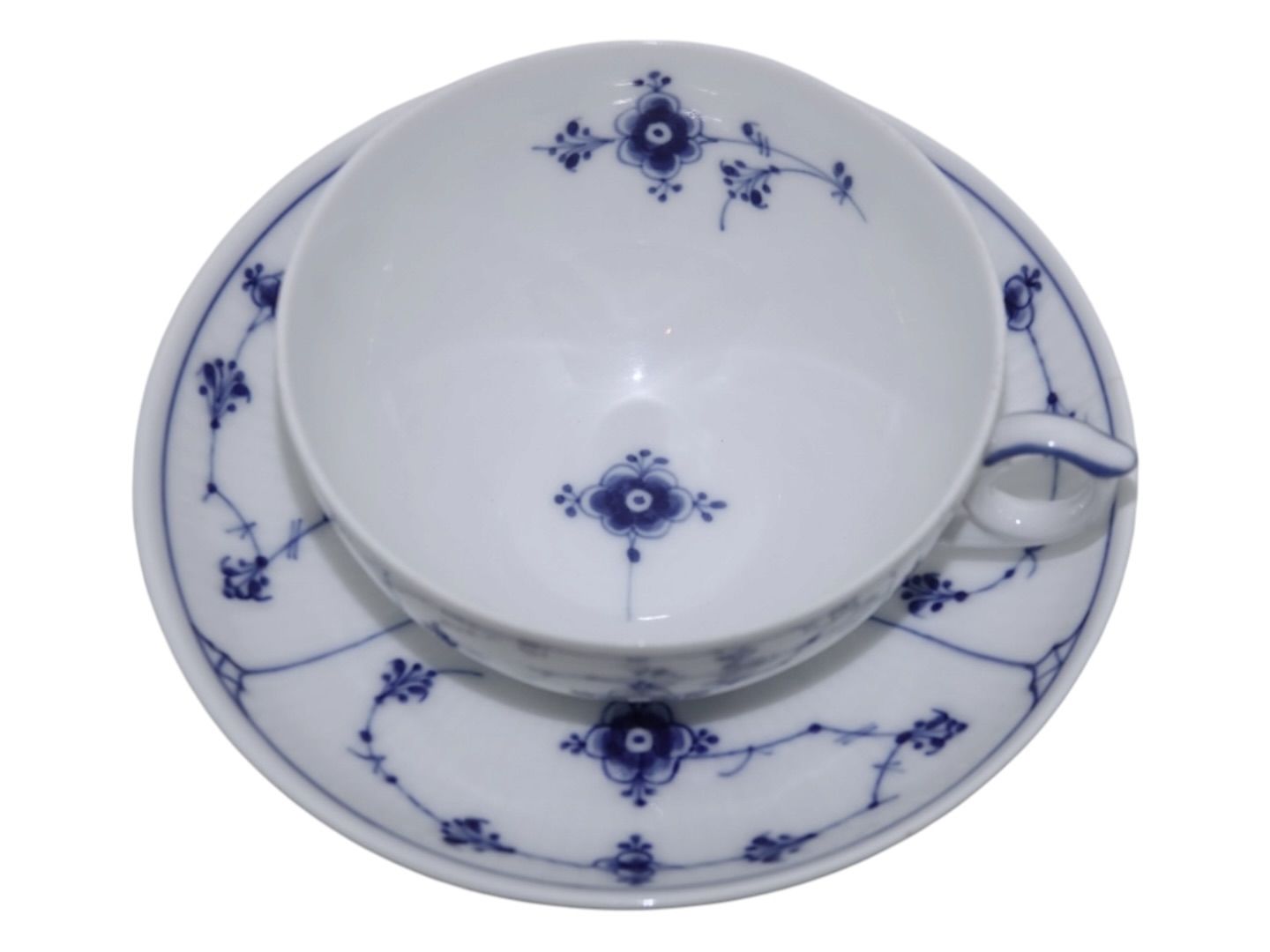 Royal Copenhagen Musselmalet Riflet, stor tekop med indvendig bemaling samt tilhørende underkop.