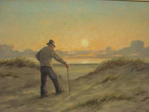 Text available in Danish: Maleri af Lauritz Sørensen - Gammel mand med stok i klitterne ved solnedgang.