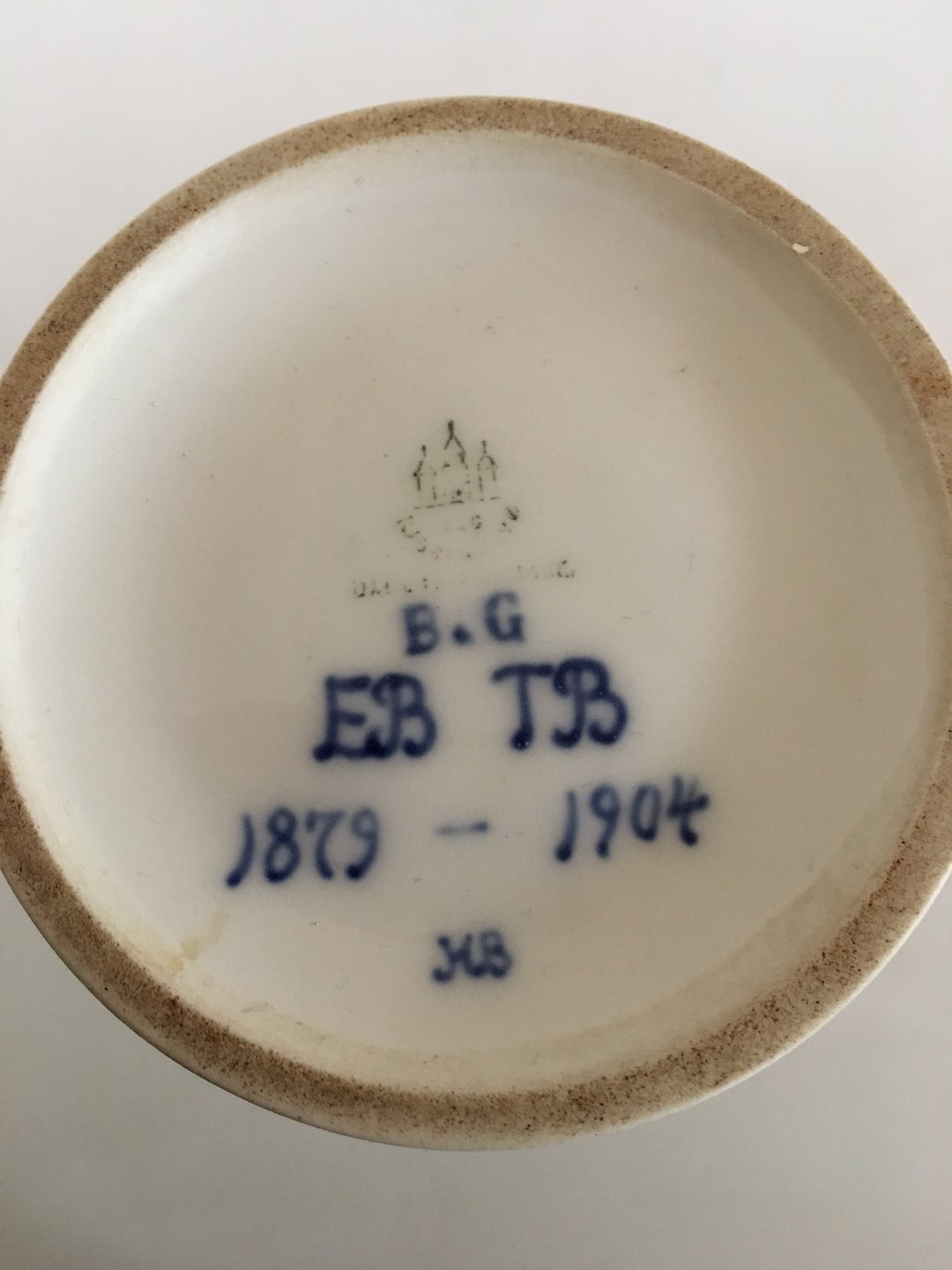 Bing & Grøndahl Unika Vase af Henriette Bing. Måler 28.5 cm Høj. I fin hel stand. I bunden mærket med EB-TB 1879-1904. Lavet til 25 års jubilæum eller sølvbryllup. Signeret HB for Henriette Bing. Guldmalet kant med frasen "For ret at leve man først maa dø, det ved hvert eneste lille frø"