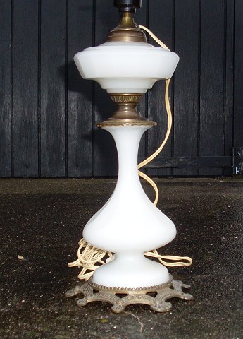 Olielampe omlavet il el af hvid opaline gals, monteret op messing fod med græsk evigheds mønster.