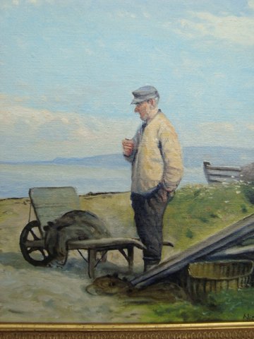 Sjællandsk kystparti med fiskeleje og fisker med trillebør.