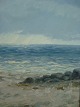 Maleri af E. Thorbjørn - Strandparti med optrukne fiskerbåde.