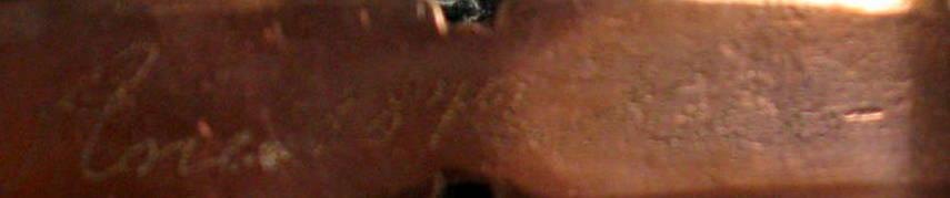 Antik æbleskivepande i kobber, 1842. På trefod med hank. Til 7 æbleskiver. Indvendig fortinnet. På hanken følgende inskription: Ane Haldner 1842. Proveniens: Sønderjysk familie.