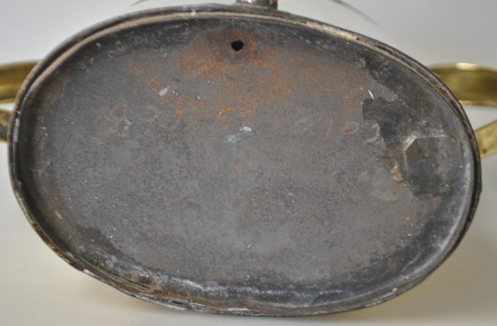 Vand maskine, empire, i messing, o. 1810 - 1820. Danmark. Glat korpus med to hanke, lågknop og hane i form af delfin. På fyrfad med løvefødder og gennembrydninger. H.: 31 cm. B.: 24 cm.