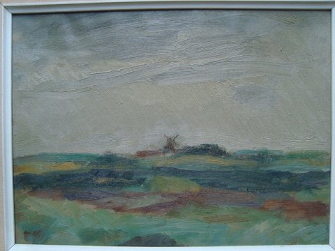 Maleri af Carl Østerbye - Landskab med Mølle, Mols 1930.
