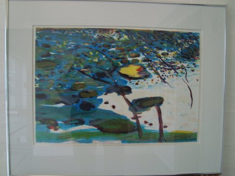 Farvelitografi af Anita Houvenaeghel - Landskab 1982.