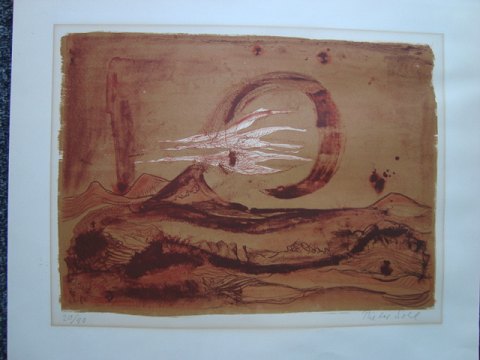 Farvelitografi af Pieter Sohl - Landskab med flyvende fugle.