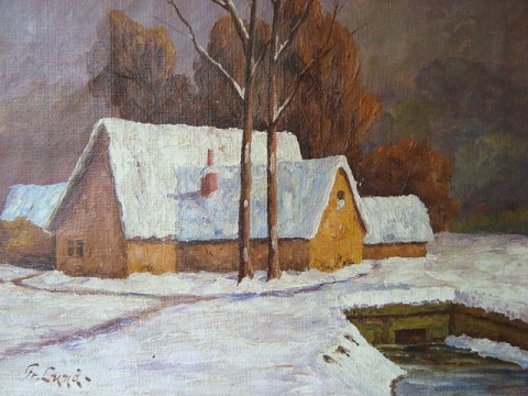 Maleri af Frederik Lund - Vinterlandskab med åløb og gård.