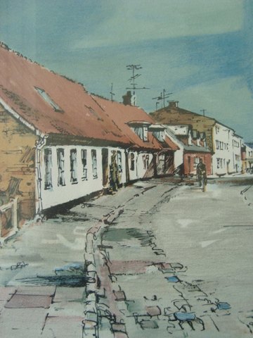 Litografi af Alex Secher 1978 - Parti fra Store Kirkestræde i Hjørring med Sct. Catharinæ Kirke.