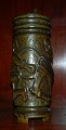 Stentøj fra Royal Copenhagen: Grønt -og brunglaseret bojan på fire fødder og tilhørende låg med fabeldyr som lågknop. Dekoreret med kæmpende mænd i relief. Designet af den danske billedhuggeren Jais Nielsen (1885-1961) omkring 1945. Fremstår i perfekt stand. 1. sortering. Fabriksmærket på bunden samt på låget. 27½ cm høj.