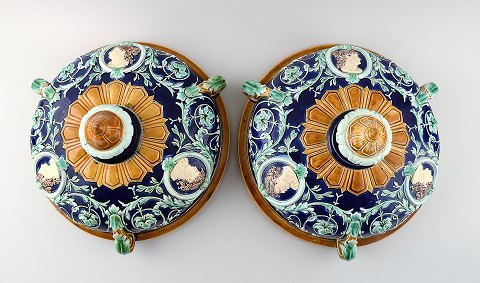 Rörstrand, et par Art nouveau ampler i fajance. Polykromt bemalet med kvinder i profil.