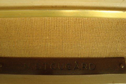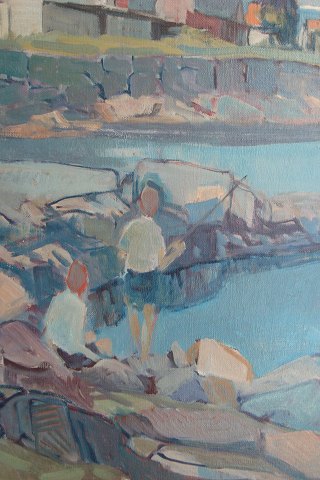 Maleri af Nis Stougaard - Kystparti fra Bornholm med fiskende børn.
