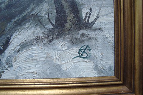 Maleri af Jens Sinding Christensen - Vinterparti med stynede popler ved vej og gårde..