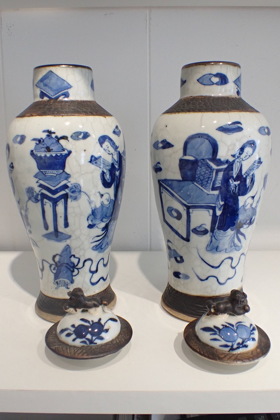 Et par kinesiske lågvaser i let hvid krakeleglasur med blå underglasurdekoration og bronzefarvede skraverede kanter og løvefigur på låg - dekoration: læsende kvinde ved skrivebord med tjener og andre klassiske dekorationselementer . Formentlig Chien Lung perioden (1736 -1795). Højde med låg: 27,5 cm. - bredeste diameter: 12 cm. I fin stand med et meget lille skår på undersiden af det ene låg. .