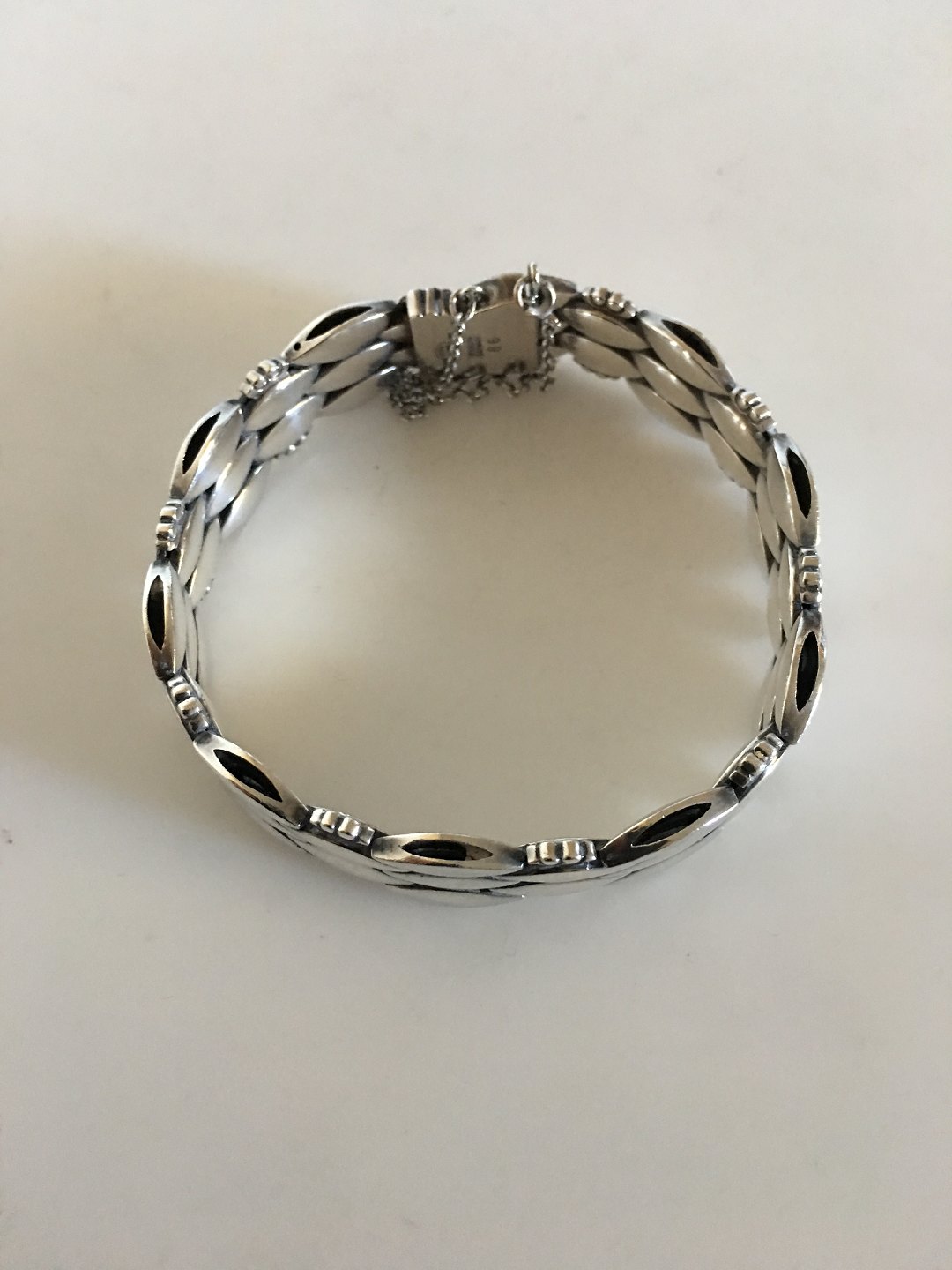 Georg Jensen Sterling Sølv Armbånd No 86. Med sikkerhedskæde. Designet af Harald Nielsen. Måler 19 cm x 1,3 cm bredt. Vejer 40 g. Fra efter 1945.