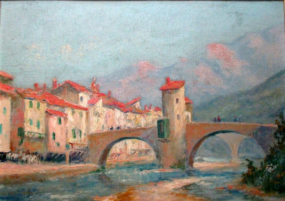 Ubekendt kunstner (20. årh. ): Byparti med bro.