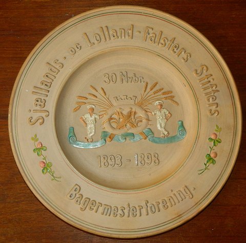 Platte i terracotta med dekorationer og tekst i relief: Sjællands - og Lolland-Falsters Stifters Bagermesterforening 30. nov. 1893-1898. Bagermesterplatten er udført hos den bornholmske lervarefabrik L. Cordsen. Fabrikken eksisterede i en kortere årrække i Rønne. 30 cm i diameter