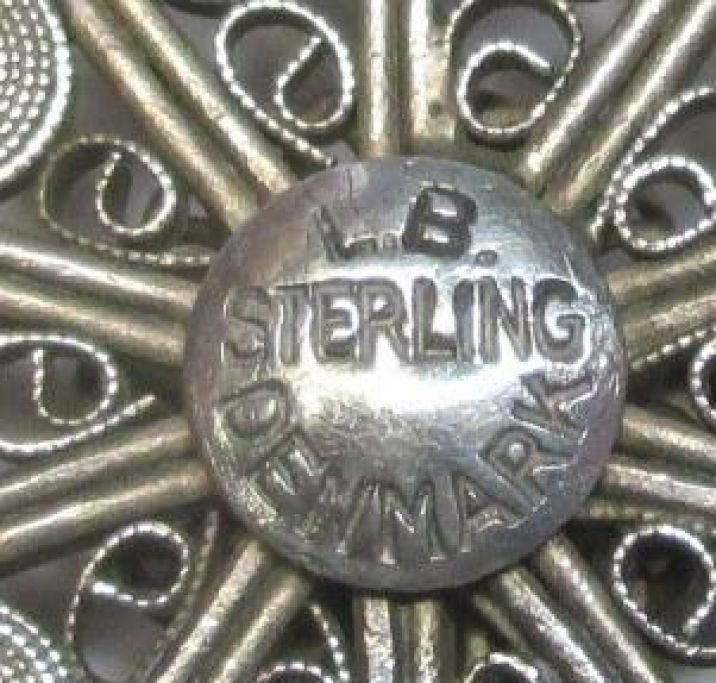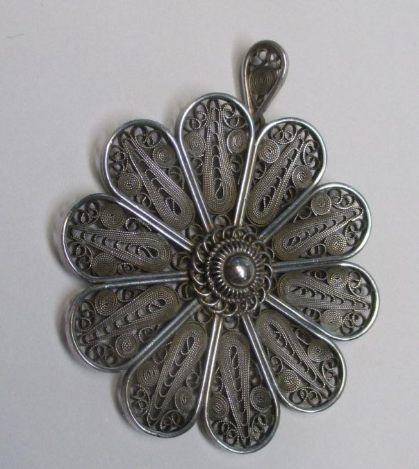 Sterling vedhæng, Laurits Berth, (efter 1957) København, Danmark. Filigran arbejde. Formet som blomst. Dia.: 4,2 cm. Stemplet.: L. B. Sterling.