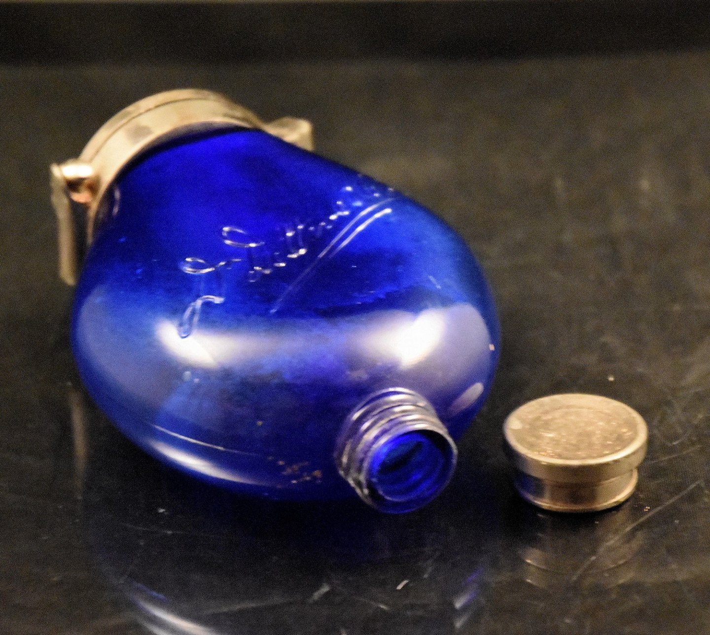 Blå spytte flaske til tuberkulose patienter. Der er et låg til at åbne foroven og et skruelåg i bunden, så flasken kan tømmes. Doktor Dettweiler ca 1900