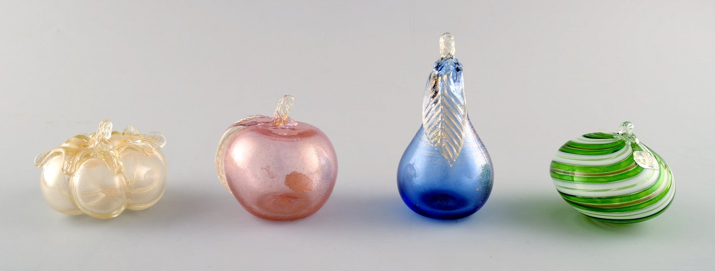 Stor samling Murano frugter i kunstglas, 1960´erne. I alt syv frugter.