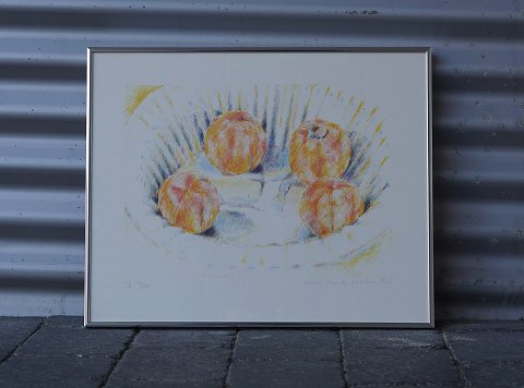Litografi med frugter, nr.: 170/250. På bagsiden er der en beskrivelse af Vibeke Mencke-Nielsen