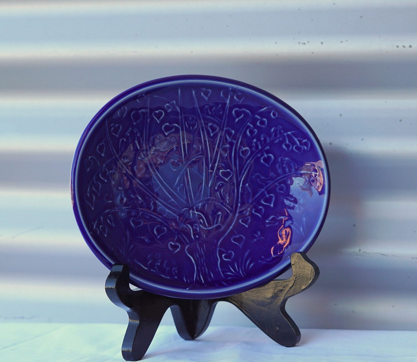 Rundt fad, blåt, med livets træ fyldt med hjerter og smådyr