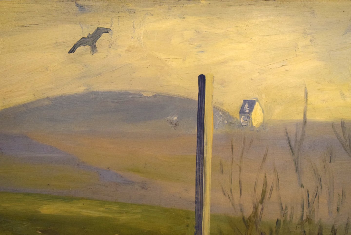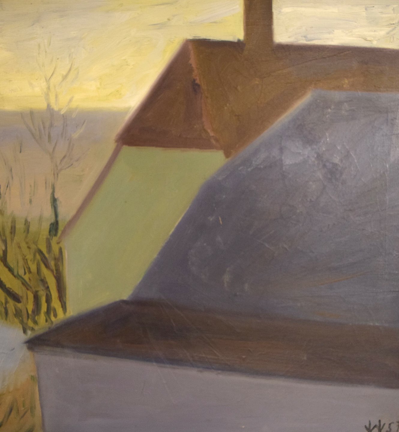 William Hansen (1908-1991), fynbomaler. Olie på lærred. Bakket landskab med husgavl og kirke i baggrunden. Dateret 1957.