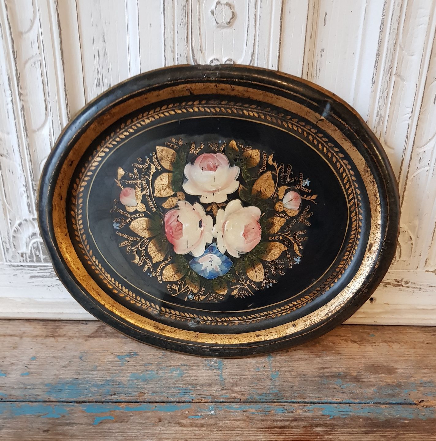 1800tals metalbakke med smukt håndmalet blomstermotiv