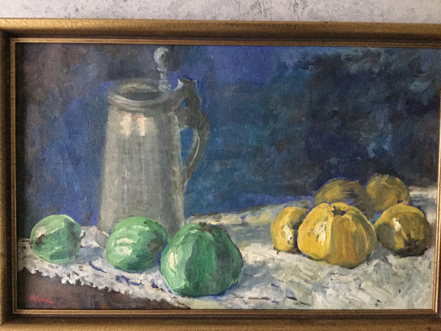 Maleri af Jens Jørgen Jacobsen - Opstilling med tinkrus og frugt.