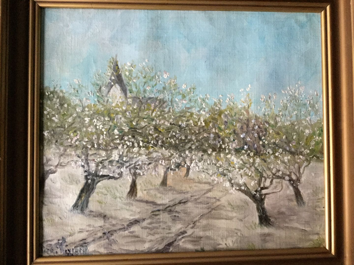 Maleri af Richard Wiggers - Blomstrende frugttræer ved Sdr. Bjert Kirke.