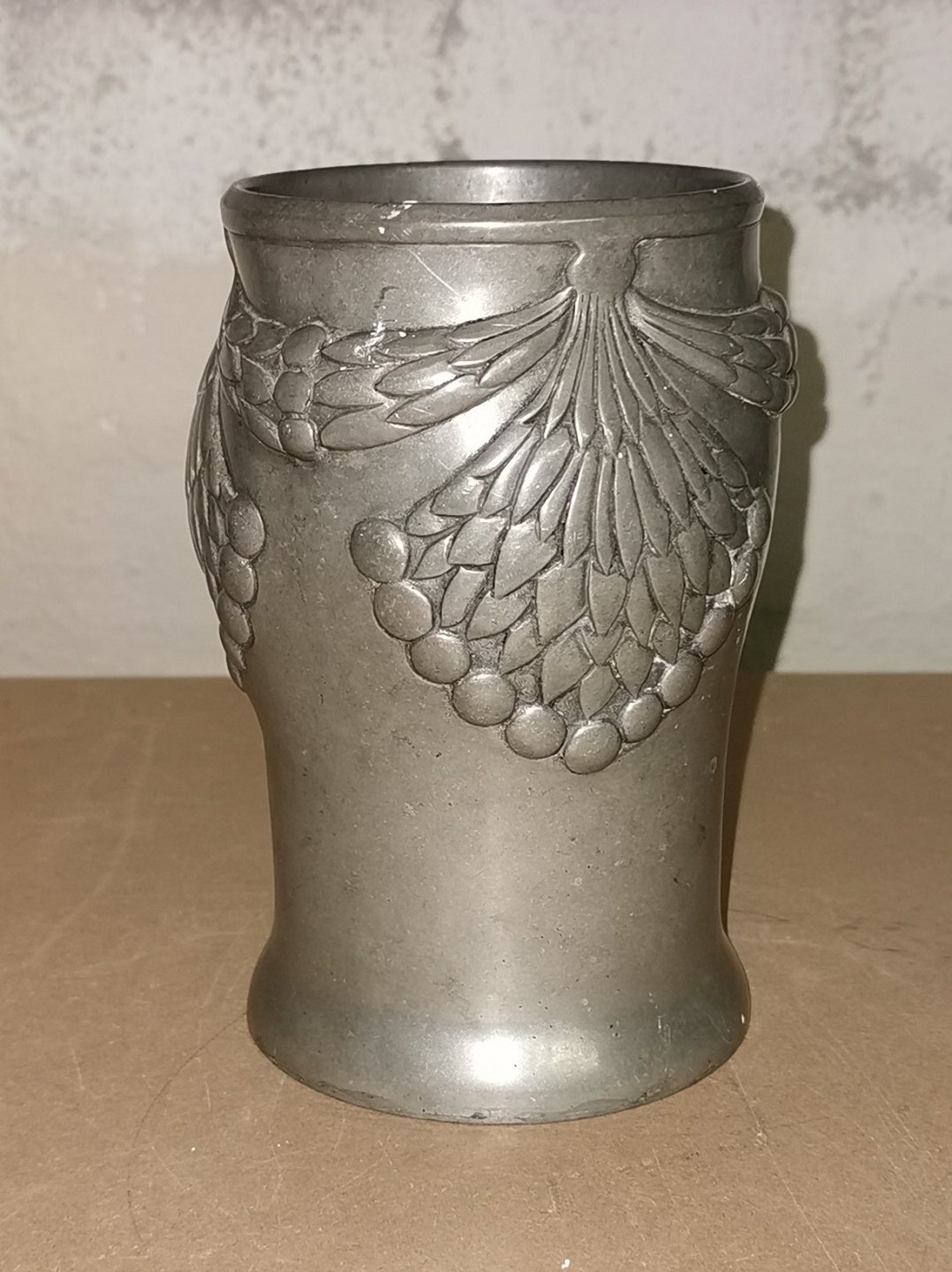 Mogens Ballin´s efterfølger: Vase i tin med dekoration med guirlander af bladværk i relief. Fremstillet på Mogens Ballin´s Eftf.s værksted Hans Peter Hertz, der også arbejdede med sølv i samme periode. Fremstillet omkring 1920. Stemplet HPH samt modelnummer T 52. Fremstår i god stand uden skader eller reparationer. Almindeligt brugsslid efter brug. H. 15 cm.