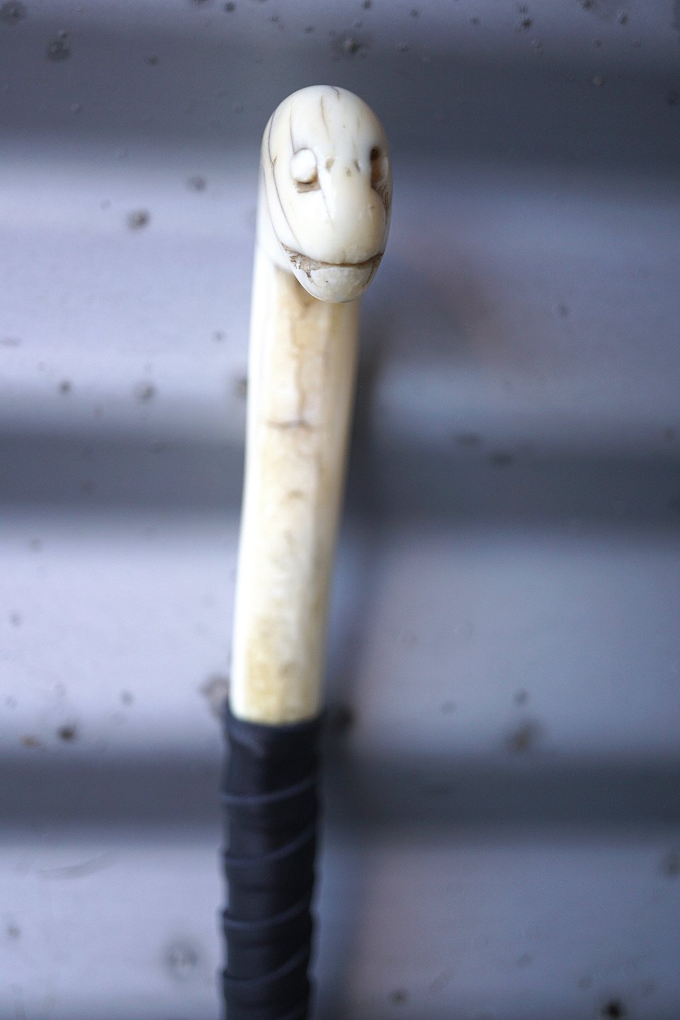 Vandrestav med udskåret elfenben håndtag. Håndtaget ligner et slangehoved, der dog har mistet det ene øje. Forneden er der sat en dup på, men der er brugsspor på duppen