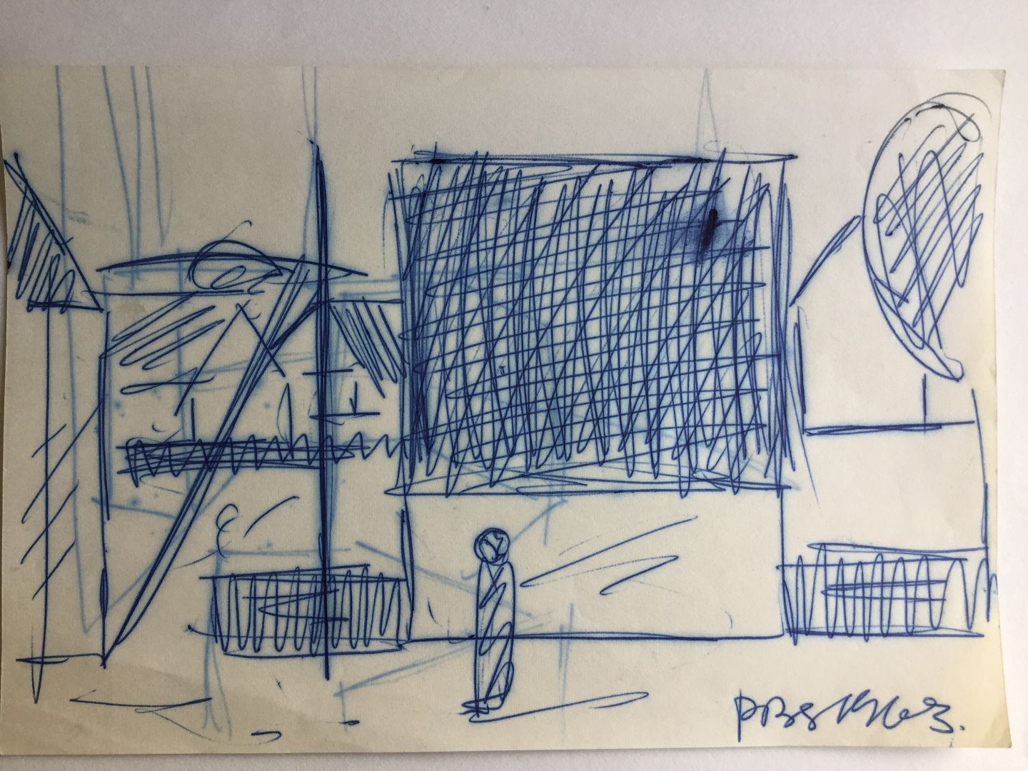 Tegning af Peder Brøndum Sørensen - Person ved huse 1963.