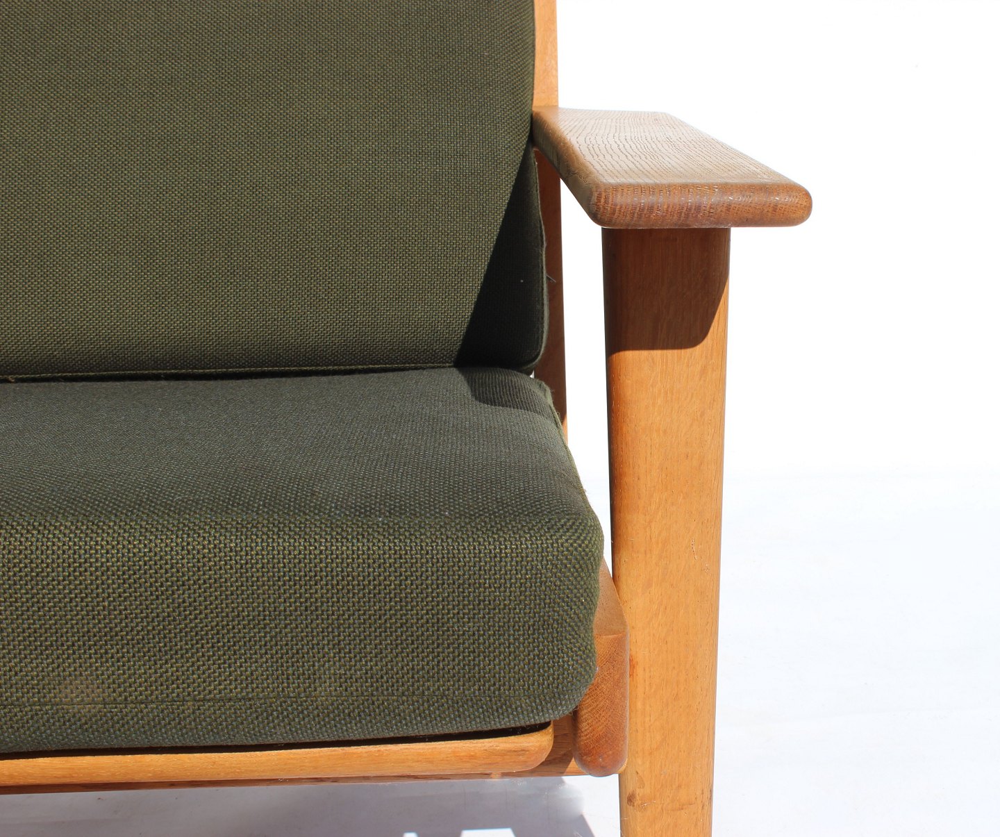 Stolen er konstrueret af solidt egetræ, hvilket giver både styrke og holdbarhed. Den høje ryg og de brede armlæn er designet til at tilbyde optimal støtte og komfort, hvilket gør stolen ideel til afslapning og længere perioder med siddende brug. Wegners sans for detaljer og ergonomi er tydelig i stolens form, som tilpasser sig kroppens naturlige konturer.