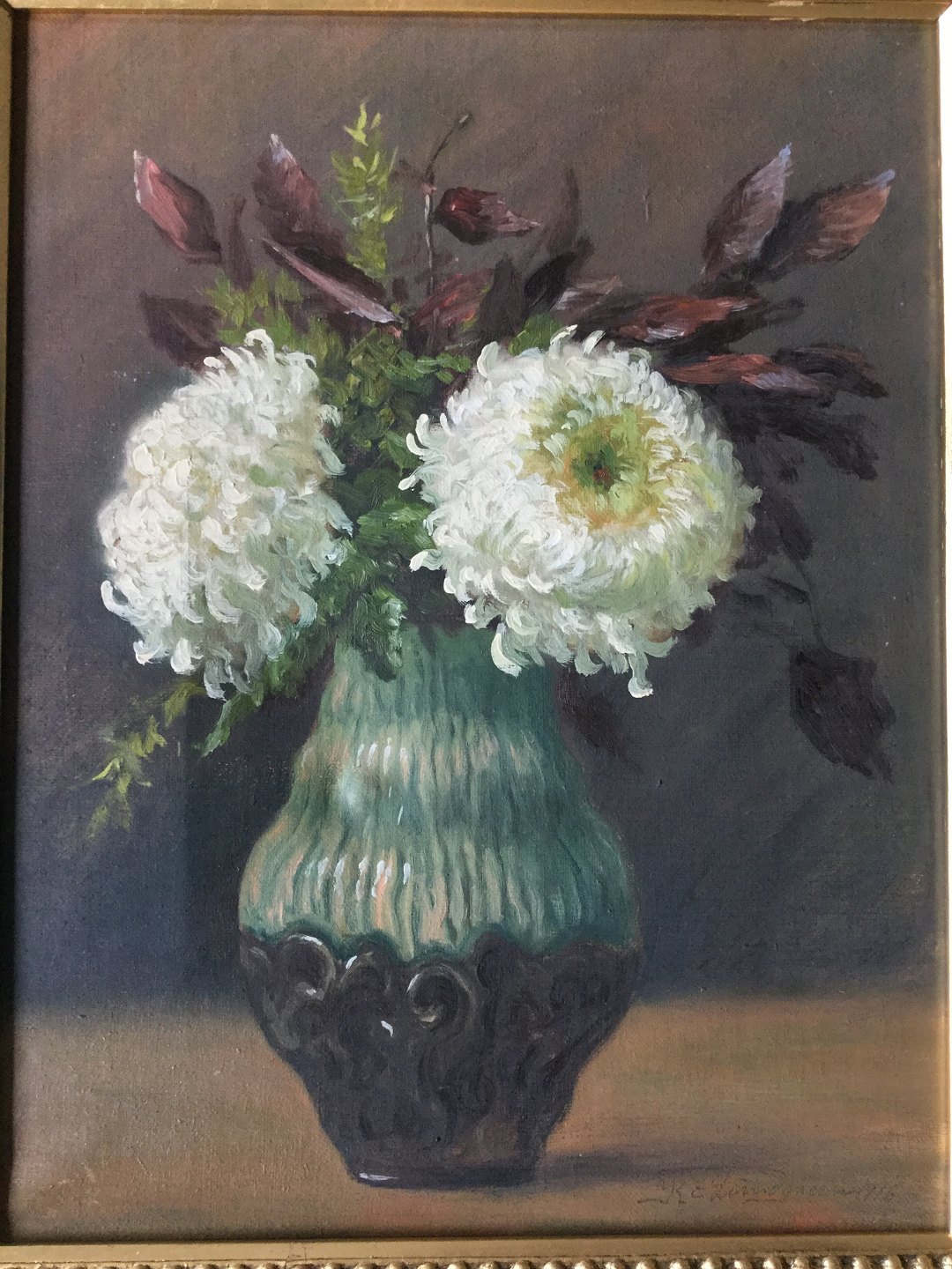 Maleri af K.E. Lundgreen - Opstilling med jugendvase med blomster 1916.