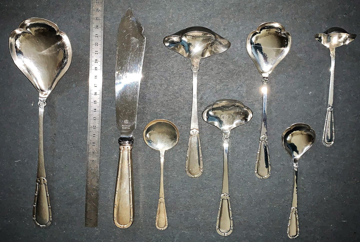 Vi et stort udvalg af serveringsdele og andre specielle dele i Alexandrine sølvbestik.