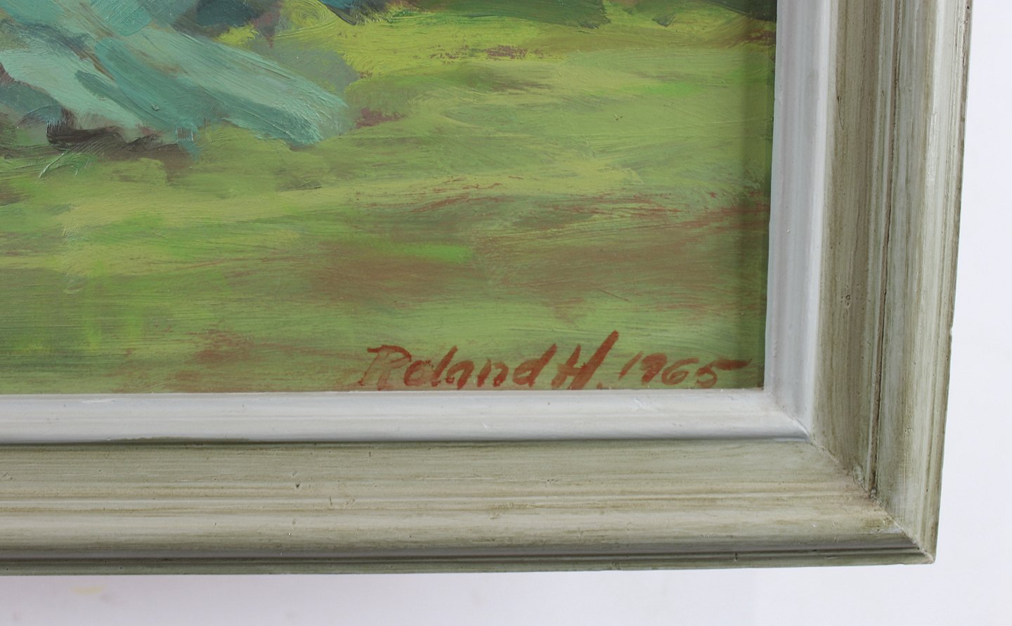 Oliemaleri i grønne farver med lysegrå træramme signeret Roland H. 1965.