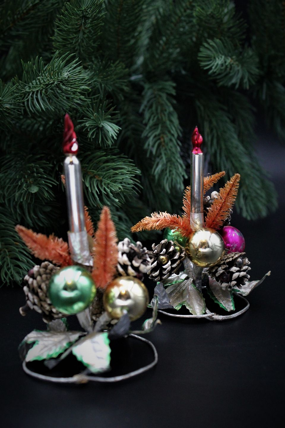 Lille juledekoration lavet i metal , glaskugler , grenkogler og lille stearinlys i glas.
