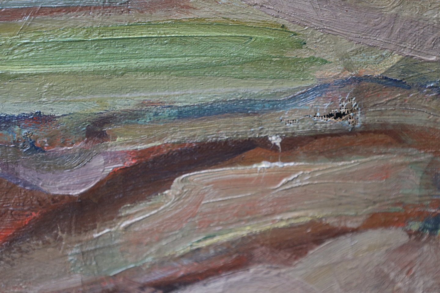 Maleri i guldramme med lærredskant. Motivet er et rødt hus i klitterne. Signeret G. April.