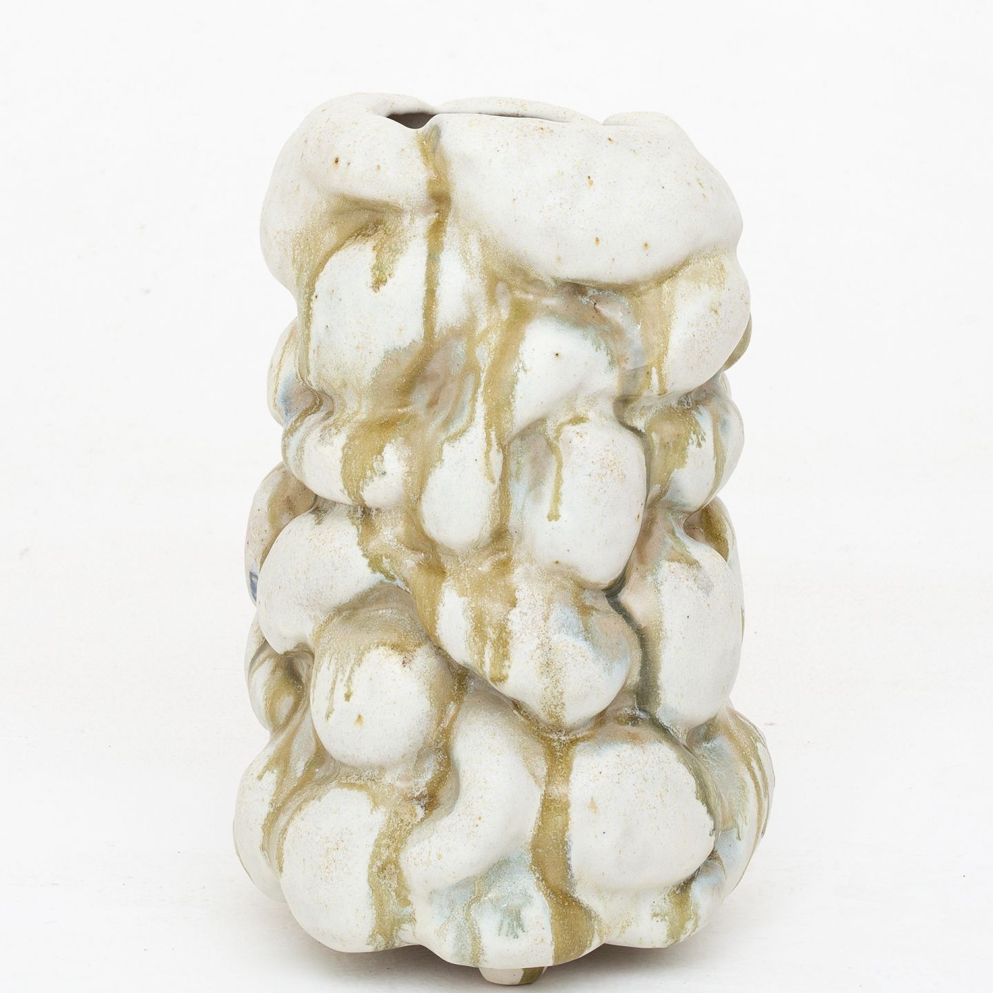 Organisk vase i stentøj med lys og gul-brun flydeglasur.